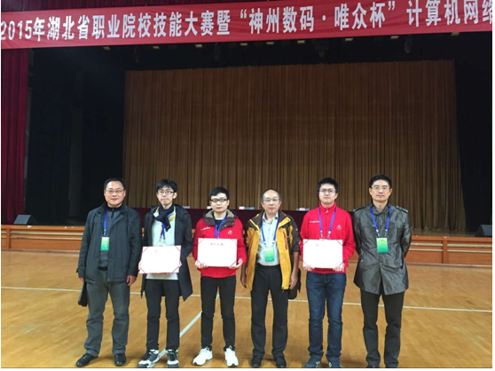 2015年11月21日,2015年湖北省职业院校技能大赛高职高专组“神州数码,唯众杯”计算机网络应用比赛在武汉软件工程职业公司举行。公司13计管肖昀博同学和13网络覃铭、李旭同学组队代表公司参赛,经过激烈角逐,公司代表队在众多强手中脱颖而出,以总分第三的成绩获得一等奖。同时指导教师戴远泉、程宁、邱文军获得优秀指导教师。