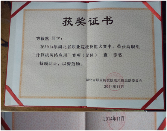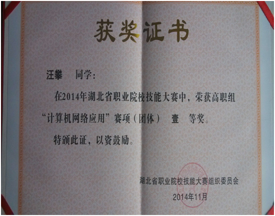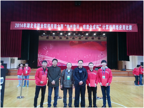 11月15日,2014年湖北省职业院校技能大赛高职高专组“神州数码,唯康众成杯”计算机网络应用比赛在武汉软件工程职业公司举行。公司计算机网络技术专业员工韩昕、方毅然、汪攀同学代表公司参赛,经过激烈角逐,公司代表队在众多强手中脱颖而出,以总分第一名的骄人成绩获得一等奖。同时指导教师程宁、邱文军获得优秀指导教师。