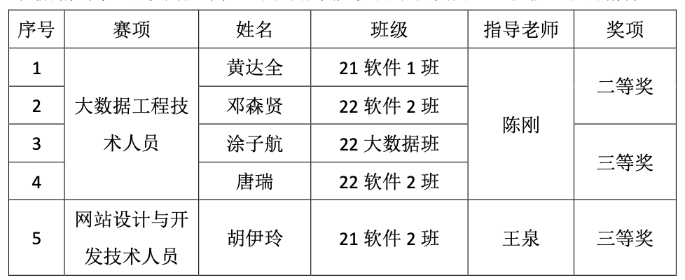 公司教师陈刚老师指导的由黄达全(21软件1班)和邓森贤(22软件2班)组成的队伍获得大数据工程技术人员赛项二等奖、另一只对由涂子航(22大数据班)和唐瑞(22软件2班)组成的队伍获得大数据工程技术人员赛项三等奖的好成绩。公司教师王泉老师指导的胡伊玲(21软件2班)获得网站设计与开发技术人员个人赛项的三等奖好成绩。