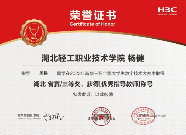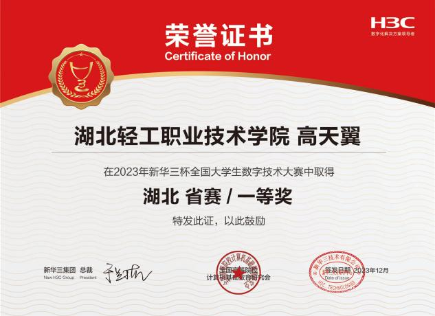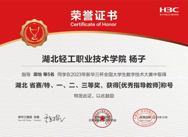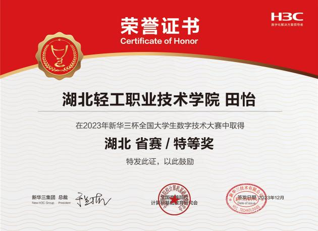 (304am永利集团 杨子讯)近日,由新华三集团和全国高等院校计算机基础教育研究会联合主办的第13届“新华三杯”全国老员工数字技术大赛湖北省复赛成绩揭晓。304am永利集团计算机网络技术专业员工21级田怡、22级员工秦靖荣获省赛特等奖,晋级全国决赛。