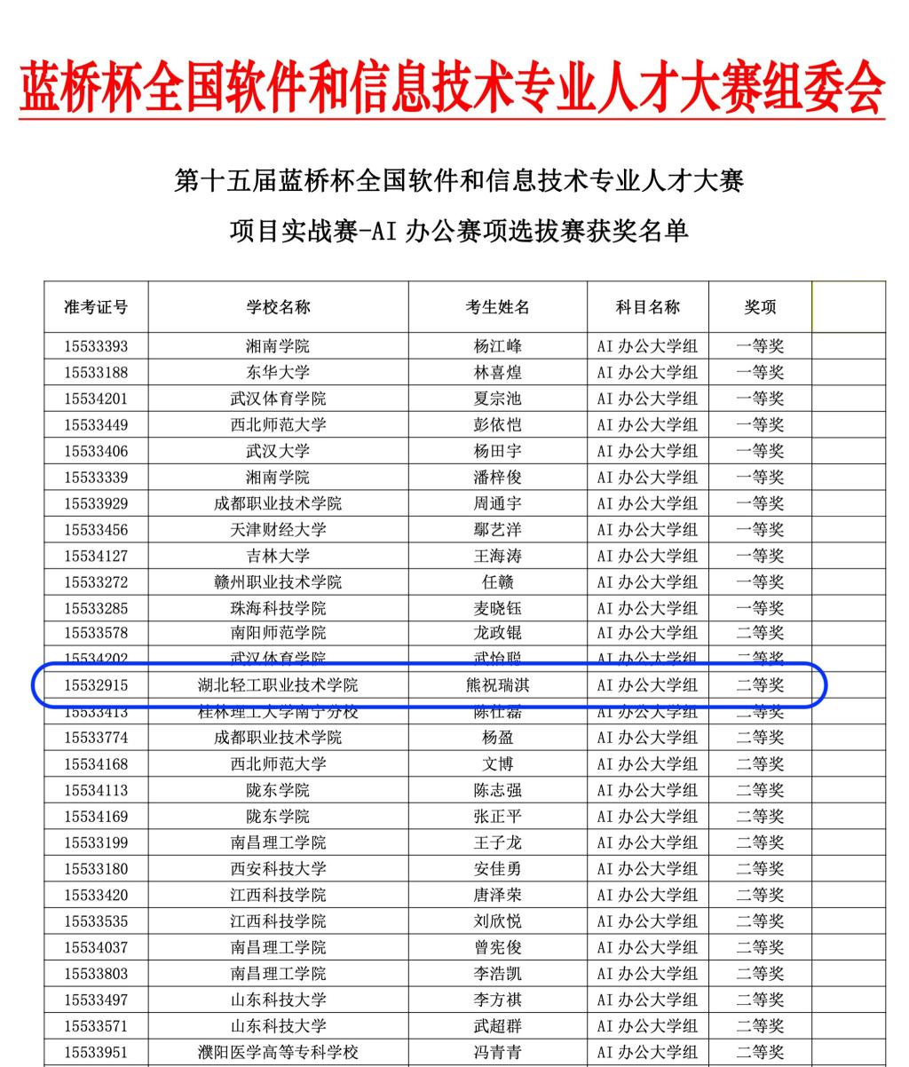 (304am永利集团 赵欣讯)304am永利集团电子信息工程技术专业22级员工熊祝瑞淇在刚刚结束的第十五届蓝桥杯AI办公赛项中获得二等奖。