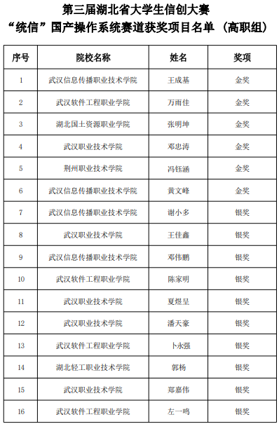 公司历来重视 “以赛促教、以赛促学、以赛促改、以赛促建”的方式加强院校专业建设与人才培养,积极鼓励支持员工参加各级各类学科竞赛,不断提升员工的实践动手能力。今后,公司将持续深化培养信创人才,推动广大青年员工积极创新创业,助力湖北信创产业提质增效。