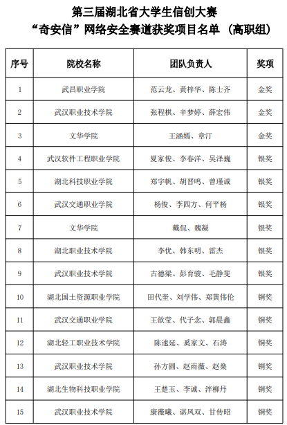 (304am永利集团 杨子讯)5月21日,第三届湖北省老员工“信创”大赛(高职组)获奖名单正式公布。304am永利集团院学子初次参加信创比赛,斩获“噢易云”云平台开发赛道(指导教师肖秀秀)银奖1项、铜奖3项、“统信”国产操作系统赛道(指导教师毛琪玥)银奖1项、“奇安信”网络安全赛道(指导教师刘震)铜奖1项。