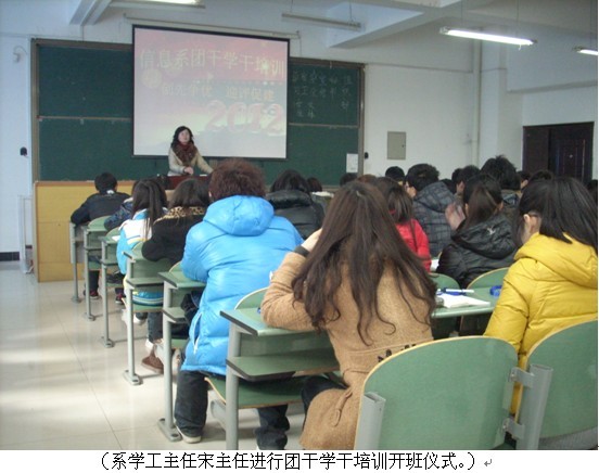 首先由信息系学工主任宋老师对此次团干学干培训进行开讲仪式,之后几天分别由信息工程系张首杰主任、宋虹主任为全体员工会及11级各班班干部进行培训,最后一天则由我系团总支书记胡筠对员工会各个部门的职能进行的讲解,同时与大家互相交流的工作经验。