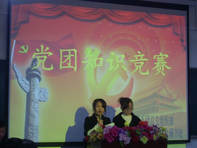 (通讯员:徐匡迪,2009年12月28日讯) 今晚7:00在A510顺利拉开了我系党团知识竞赛决赛的帷幕,首先映入我们眼帘的是得分比较容易的必答题和互答题,然而真正激烈的竞争却是来自于冲击我们视野的图片题和撞击我们听觉神经的音乐题,而那别具一格的“红色记忆”即兴演讲让我们有了展现自我风采的平台,也让我们有了表达对我党建设认识的机会。而比赛过程中,选手三人的明确分工,和相互协作,让我们感受到这次比赛不仅锻炼了我们的个人知识水平,也让我们体会了集体团结的重要性。