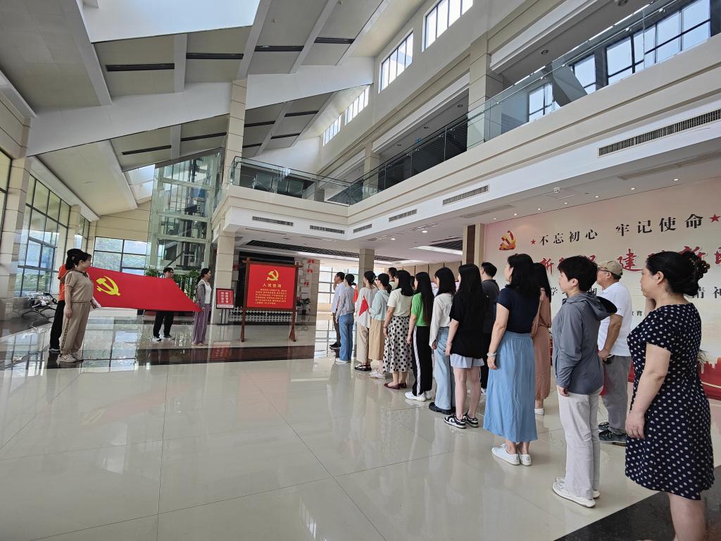 在国防教育馆前厅,在党总支书记程宁同志的带领下,全体党员教师高举右拳,面向鲜红的党旗宣誓,铿锵有力的誓言激发了教师们不忘初心、牢记使命的责任与担当。