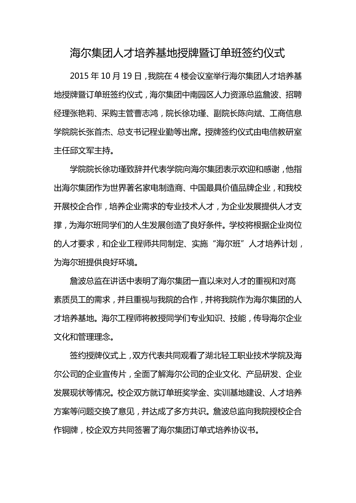 海尔集团人才培养基地授牌暨订单班签约仪式