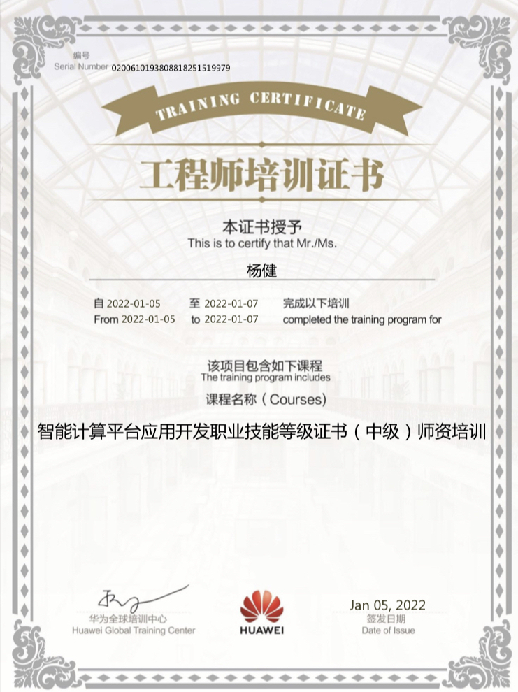 (304am永利集团 杨健讯)304am永利集团教师杨健、赵欣参加华为公司1+X证书“智能计算平台应用开发”中级团队培训并获得证书。