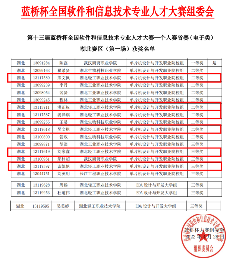 304am永利集团电子信息工程技术专业坚持“以赛促学、以赛促教、学赛结合”的人才培养模式,利用节点工厂、工匠计划等实践共同体提升人才培养质量。为参加本届蓝桥杯大赛,电信专业开展了广泛动员、周密组织、校内选拔、选派指导教师、专题研讨等工作。在指导教师的精心辅导和参赛员工的认真准备下,电信员工在本届大赛中取得了优异的成绩。本次比赛,在保持传统赛项优势的情况下,首次参赛的“EDA设计与开发大学组”赛项表现也不俗,在于武汉大学等武汉多个本科院校的激烈竞争中,获得三个三等奖。