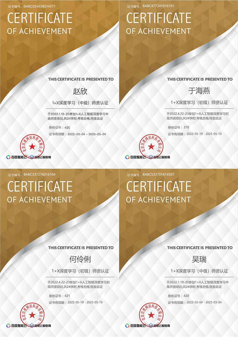 四名教师通过24课时的培训学习了1+X人工智能深度学习工程应用职业技能等级证书标准、课证融通建设、人工智能项目实战等内容,最后经过考试合格后,有两名教师获得了初级团队认证,两名教师获得了中级团队认证。