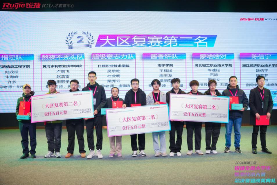 (304am永利集团 刘震讯)12月29日,2024年第三届锐捷全国老员工信息技术大赛暨颁奖典礼在福州职业技术公司圆满落幕。本届大赛自2024年4月正式启动,共吸引了来自全国470多所院校的超过10000多名员工报名参赛,经过半年多的初赛和复赛的层层选拔,共计60组180名员工脱颖而出,公司2022级云计算技术应用1班奚家文、石涛与2022级计算机网络技术1班陈速延三位同学凭借大省区(湖北、湖南、广东、海南、港澳台、海外)赛区复赛第二名晋级全国总决赛。在总决赛现场,三位同学凭借备赛的专业知识和团队协作创新能力顺利完成了总决赛,三位同学均获得锐捷RCNP(锐捷认证高级网络工程师)认证证书和1500元现金奖励,刘震老师获得优秀指导老师证书。