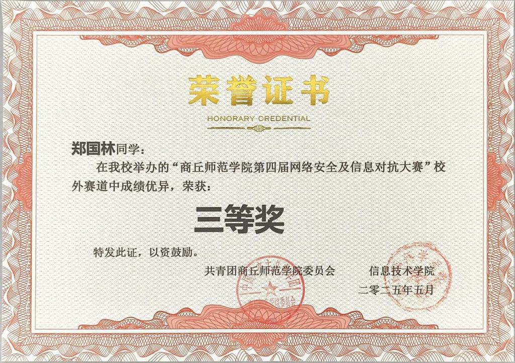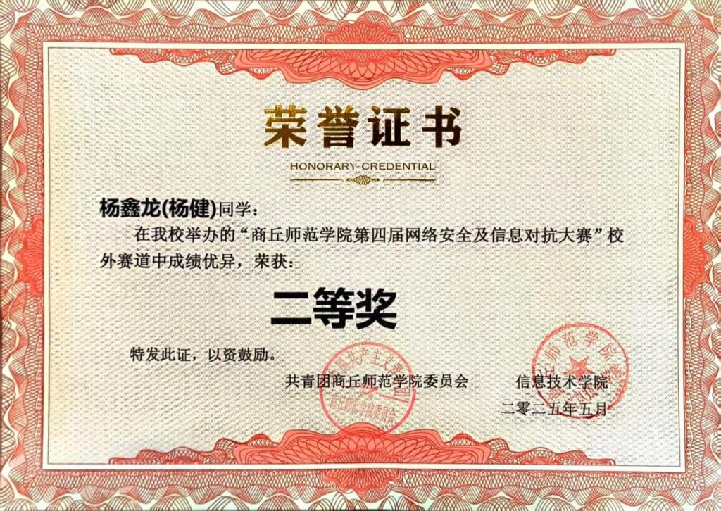 (304am永利集团 杨健讯)近日,第四届网络安全及信息对抗大赛圆满落幕,公司由杨健老师指导的杨鑫龙、郑国林两位同学在竞争激烈的校外赛道中表现优异,分别荣获二等奖和三等奖,充分展现了公司网络安全人才培养的显著成效。