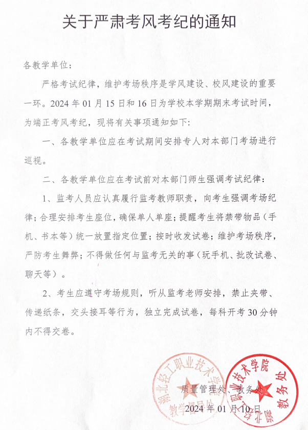2023-2024学年第1学期期末考试考风考纪建设通知