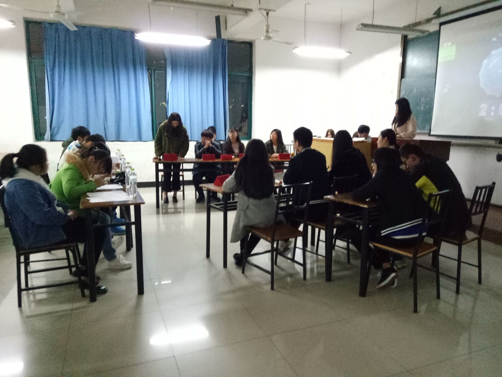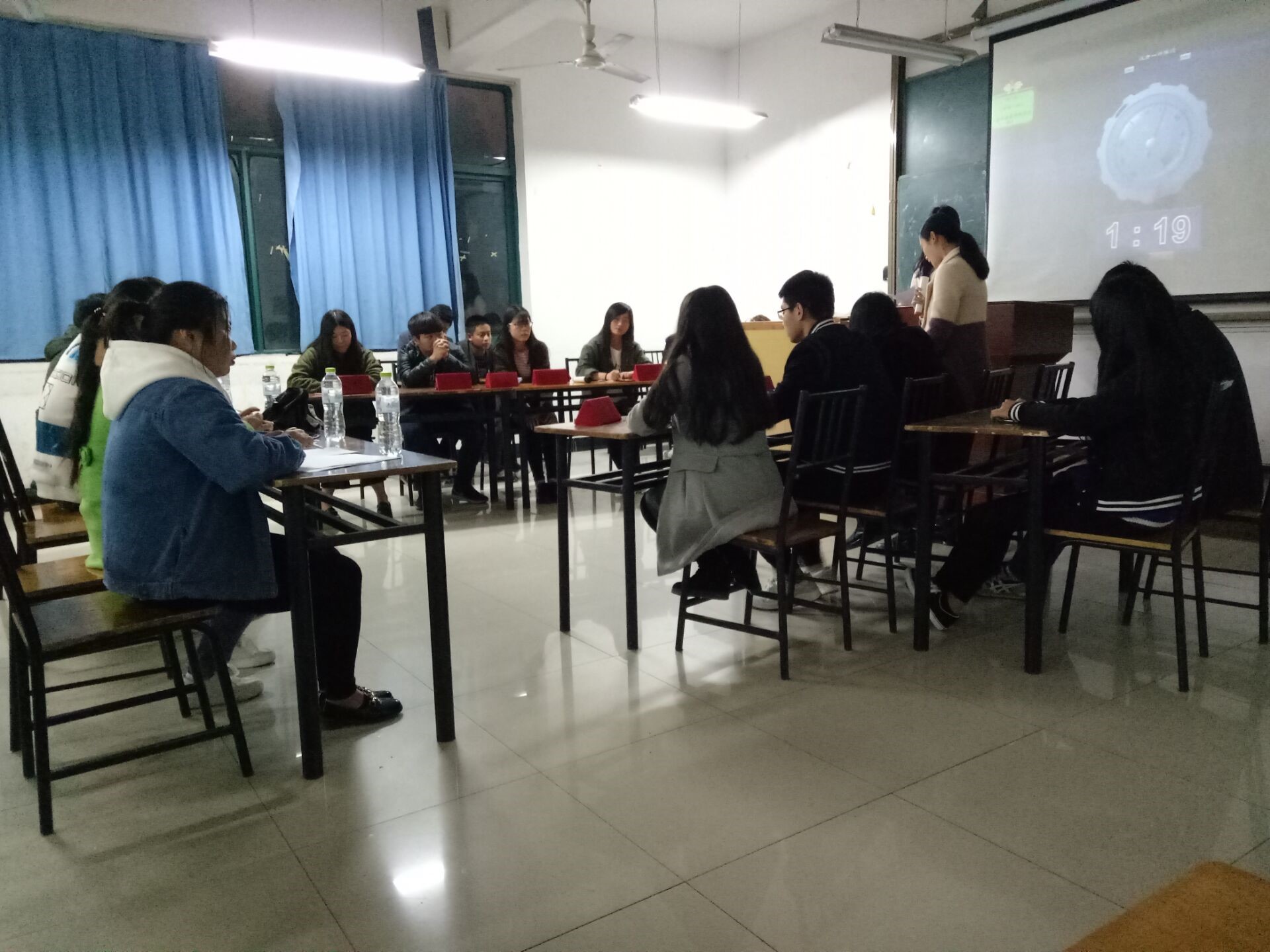 公司2016级工商信息系14个班级共同举行了一场辩论赛。每个星期都会打两轮比赛,在B303教室19:00准时开始。首先,主持人介绍了到场的嘉宾,接着