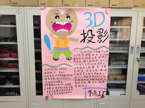 (2013年6月16日,通讯员:尹灿)今天开始的是“节点工厂”的第二次活动,比赛进行的是3D全息投影的制作,活动在下午七点钟开始,六点钟的时候,工作人员都相继来到了会场,开始了前期的准备工作,包括将成品进行展示的前期演示,经过我们工作人员的细心指导,为了将产品包装的更好看,当天,参加活动的还有院社团联合会主席余宗宗,啤酒系团委书记,并且还有各兄弟社团,活动进行了将近两个小时,为了指导同学们作出心仪的产品,我们工作人员分批对他们进行了指导,活动接近了尾声,大家都拿着自己认为比较满意的东西,大家一起进行了合影,活动结束后,社团内部开了一个总结会,总结此次活动不足,还有需要改进的地方。