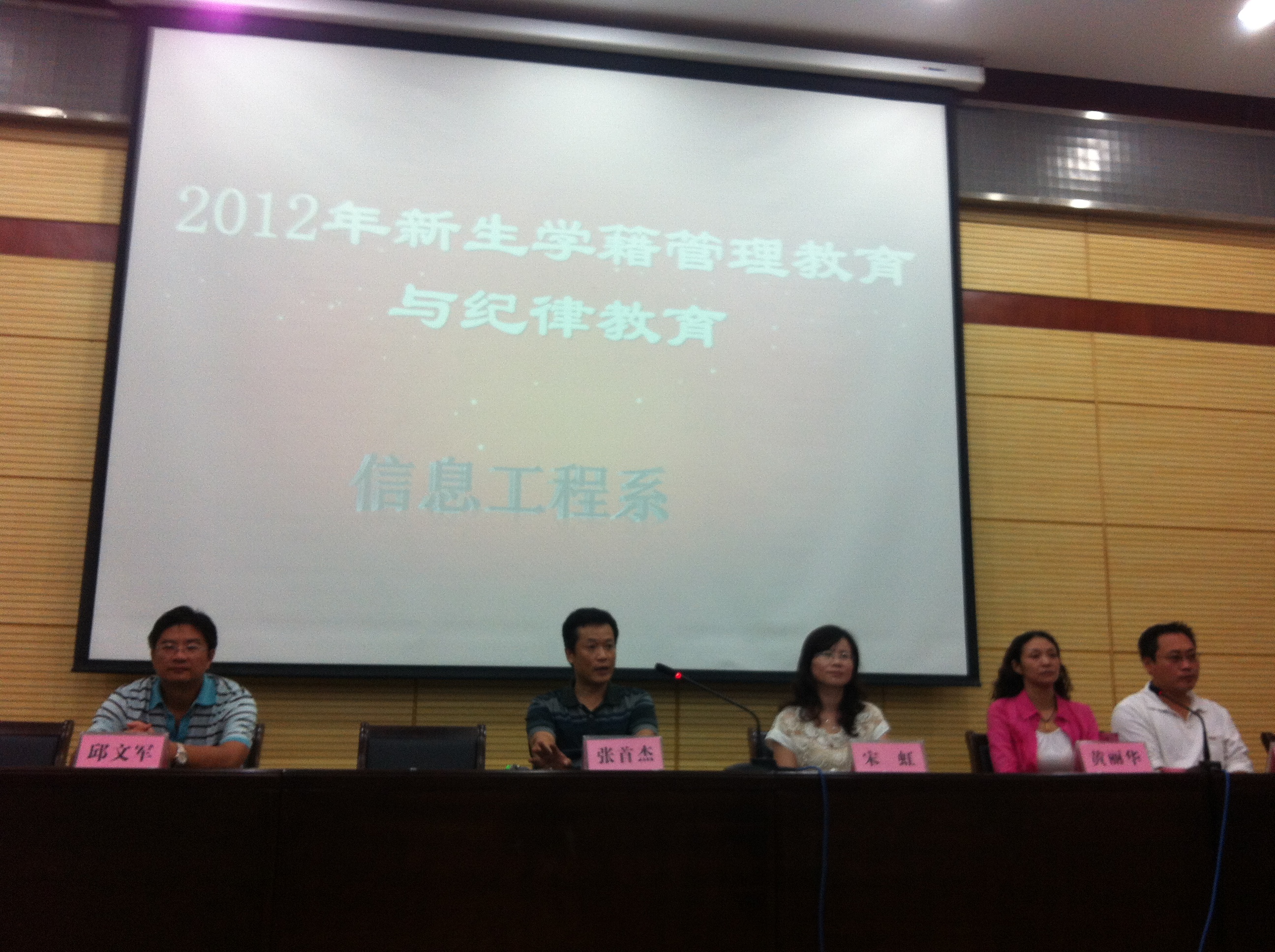 又是一年新生到,2012年9月,信息工程系迎来了来自五湖四海的300多名莘莘学子。为了让新生尽快适应校园环境和老员工活,完成从中员工向老员工的角色转变,了解公司并热爱所学专业,熟悉公司学籍管理以及员工管理纪律规定,信息工程系“2012级新生学籍管理教育与纪律教育”于2012年9月24日在公司学术报告厅隆重举行!信息工程系主任张首杰老师和系学工主任宋虹老师分别为新生们介绍了学籍管理以及纪律管理的相关规定,参加此次会议的有系会电教研室主任黄丽华老师,电信教研室主任邱文军老师,网络专业负责人程宁老师,以及全体辅导员和班主任老师。