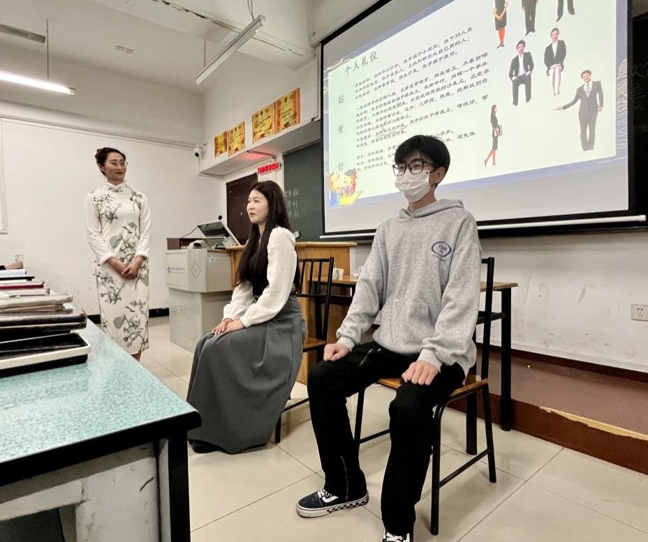 礼仪“成于众而行与外”。在“行礼”环节中组织班级同学积极展示,以坐、立、行等基本礼仪进行情景演示,最后,大家一起学习最具中国特色的见面问候礼仪“拱手礼”,全班同学齐做拱手礼并互道祝福。