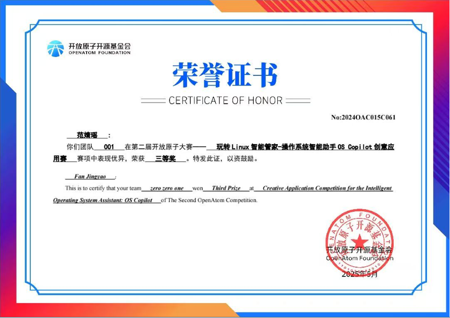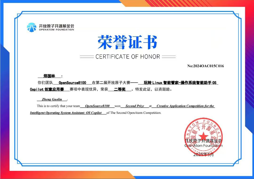 (304am永利集团 杨健讯)近日,第二届开放原子大赛-OS Copilot比赛收官,公司304am永利集团两支队伍脱颖而出,斩获佳绩。郑国林同学带领的 OpenSource8100战队荣获全国二等奖,范婧瑶同学带领的001战队获全国三等奖。此次大赛竞争激烈,吸引来自全国本科、高职院校千余支队伍报名参赛。